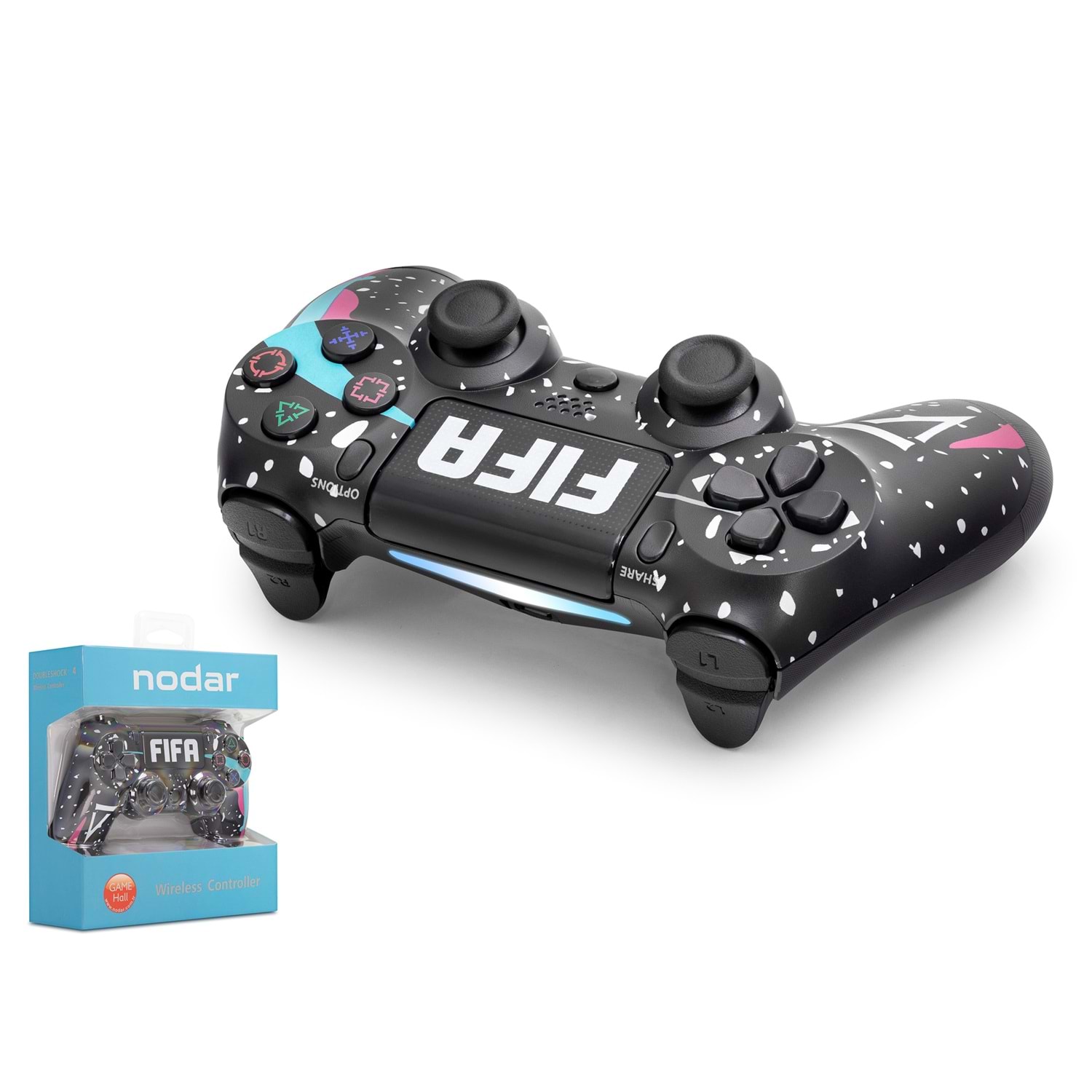 Nodar ND400R, PlayStation 4 platformunda spor oyunları deneyimini zirveye taşımak için geliştirilen, FIFA temalı özel grafik tasarımını modern kontrol teknolojileriyle birleştiren profesyonel bir kablosuz oyun koludur. Siyah gövde üzerindeki dinamik beyaz desenler, dokunmatik paneldeki ikonik "FIFA" logosu ve ergonomik yapısıyla hem şık bir görsel stil sunar hem de en kritik maç anlarında mutlak kontrol sağlar.